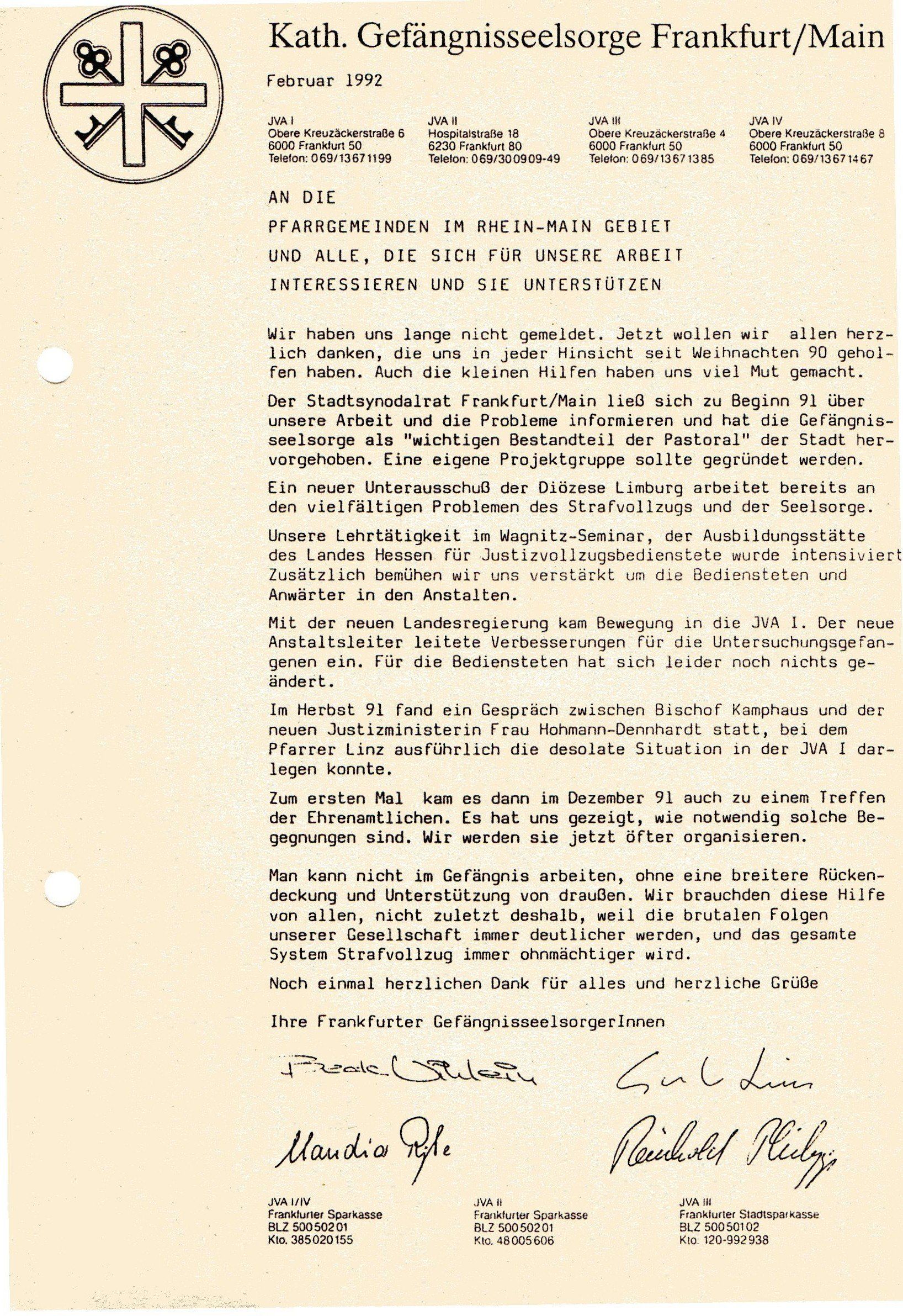 - Gespräch in Limburg mit Bischof Kamphaus, der Justizministerin Hohmann-Dennhardt, Gert Linz und Mitarbeitern. Es hatte Folgen für die JVA Frankfurt I > 1992